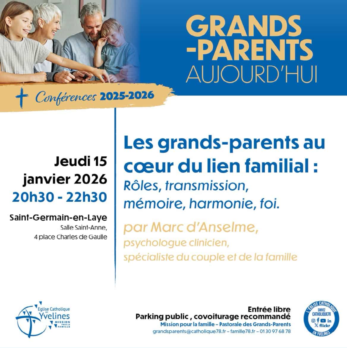 La pastorale des grands-parents du diocèse de Versailles organise une conférence ayant pour thème : « Les grands-parents au coeur du lien familial ». Animée par Marc d’Anselme, psychologue clinicien, spécialiste du couple et de la famille.